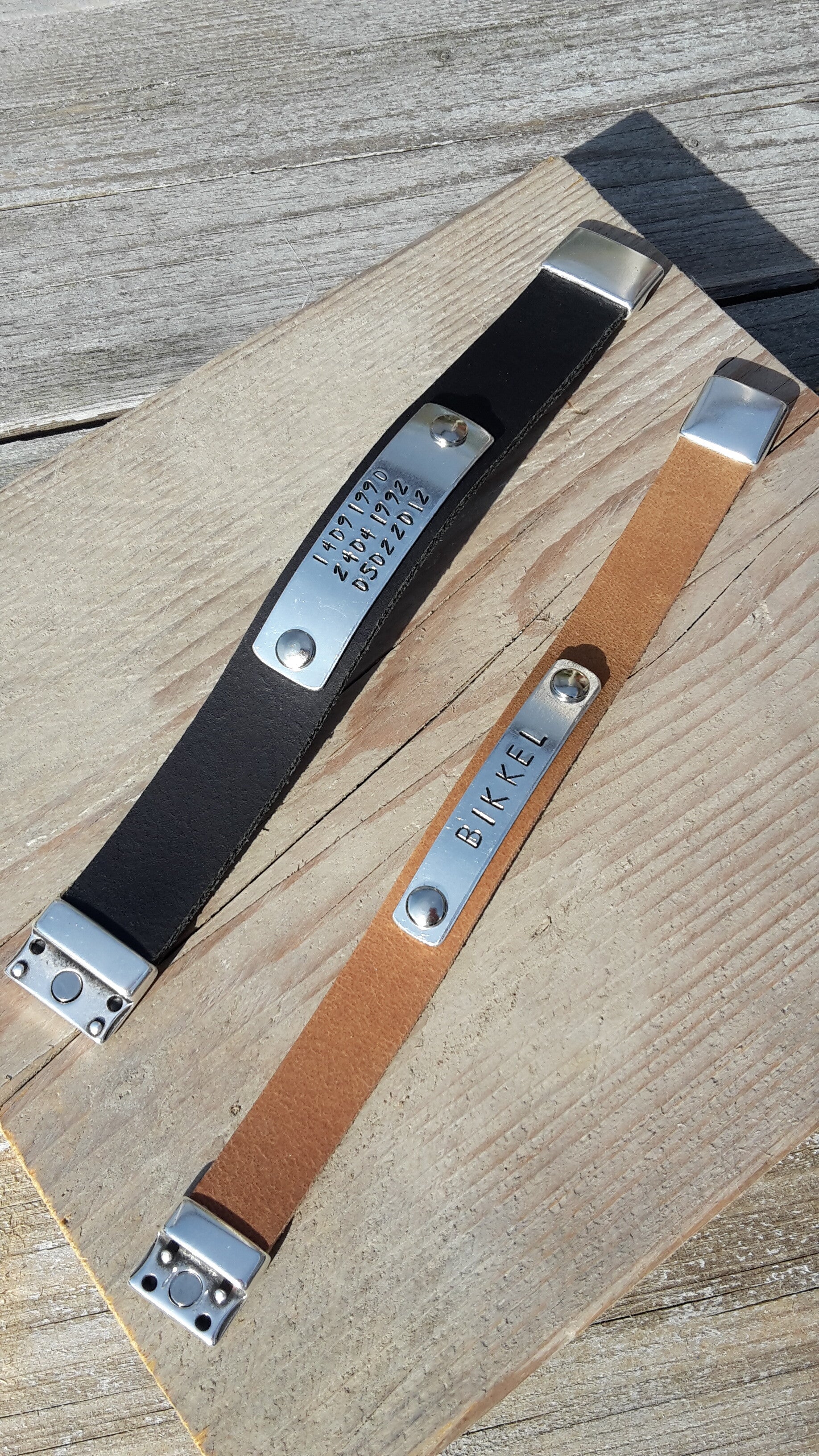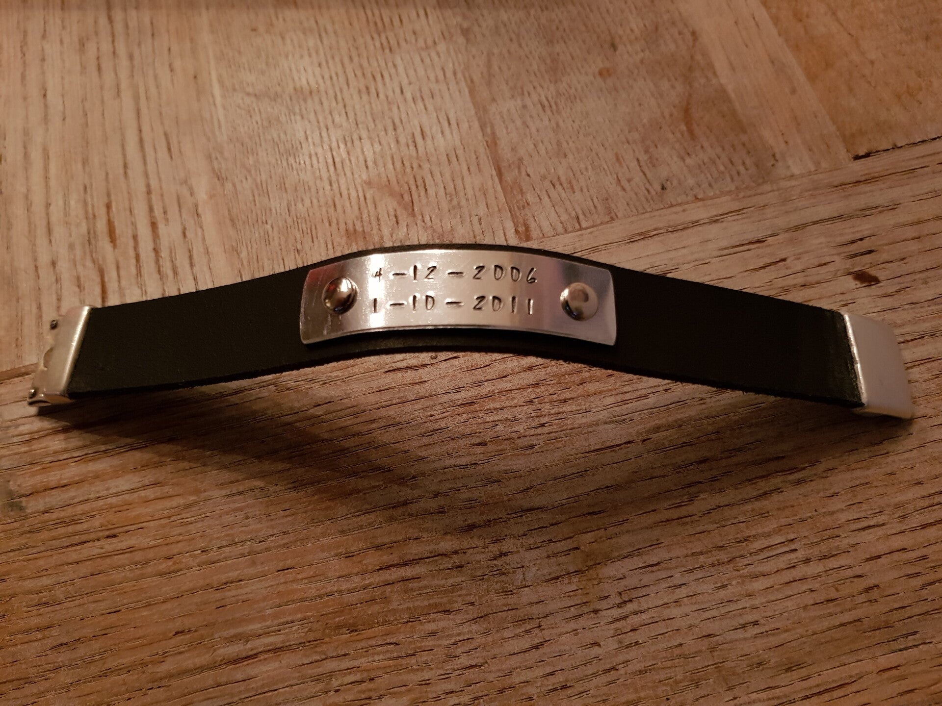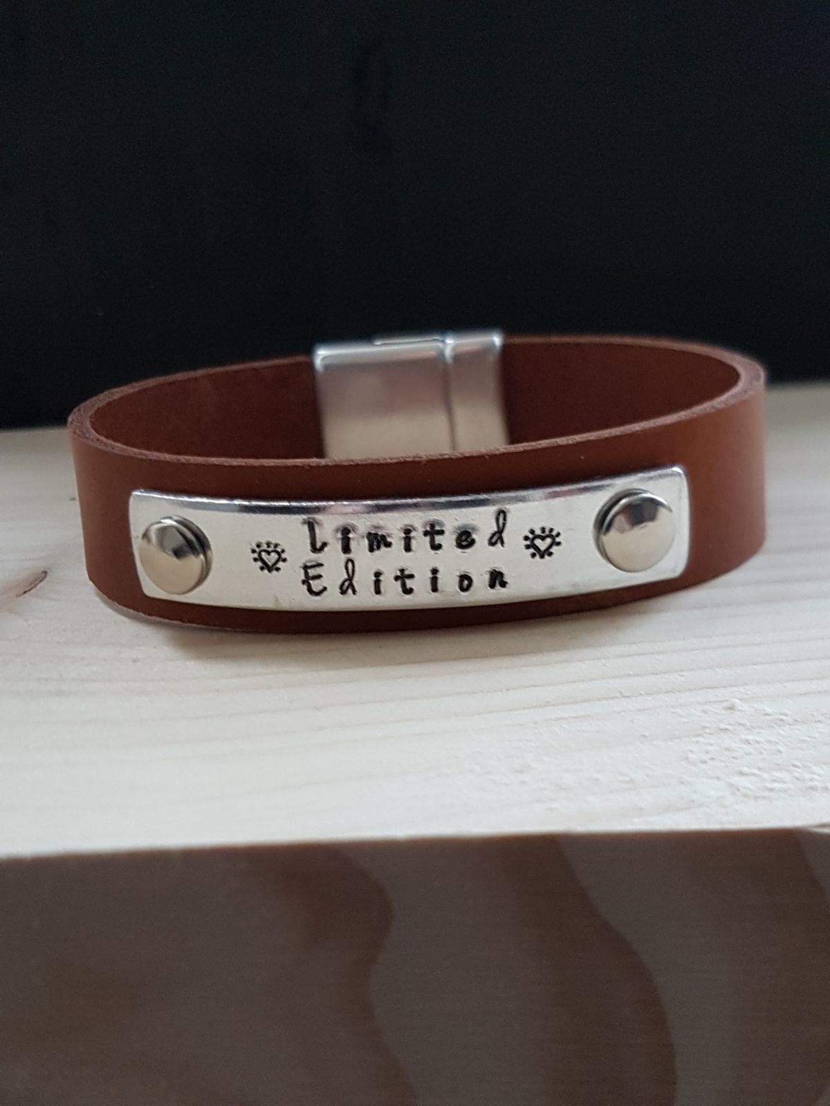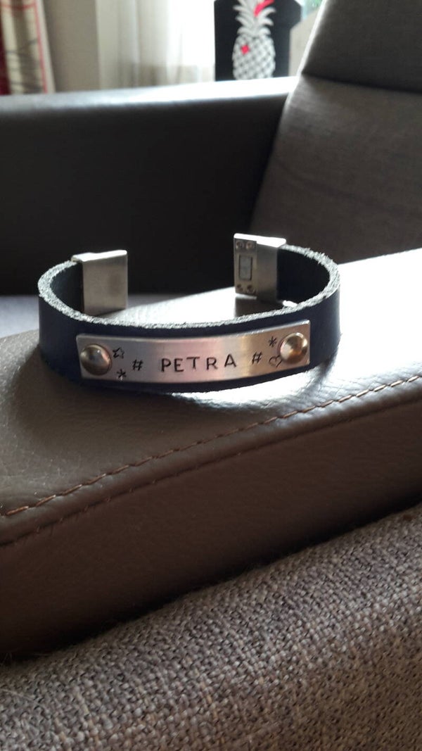 De tekst word met de hand geslagen daarom staan de letters niet altijd perfect recht. Dat maakt iedere armband uniek.